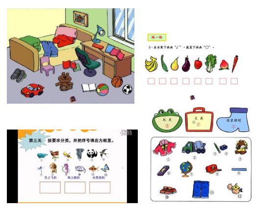 师:像上面整理房间的过程就是分类,书本、铅笔、文具盒、台灯是一类,都是学习用品,所以放在一-起;皮球、玩具熊、玩具车都是玩具,放在一起;上衣、裤子、鞋都是服饰,放在一一起。